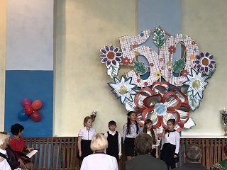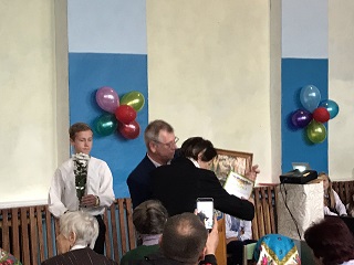 Директор НВО вручає подяки та подарунки – ветеранам педагогічної праці Янкович Ніні Кирилівні, Богданенко Людмилі Петрівні, Друкаренко Валентині Павлівні, а також волонтеру, керівнику гуртка різьблення Шупик Миколі Васильовичу та директору Центральної бібліотеки ім. Лесі Українки міста Київ Ковальчук Людмилі Іванівні. А дівчатка в вишиванках дарують квіти.