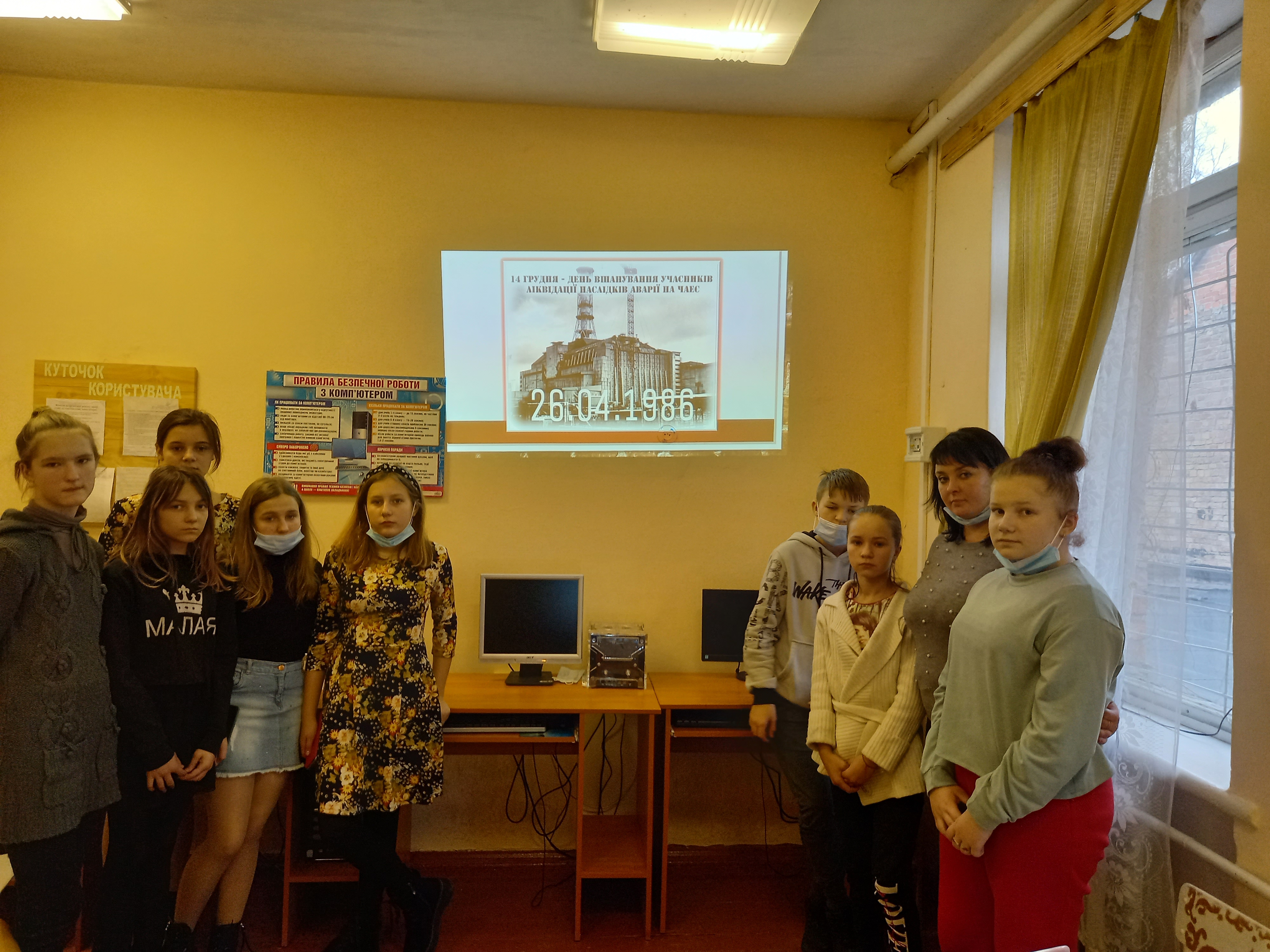 14 грудня - день, коли Українська держава вшановує героїчний подвиг учасників ліквідації наслідків аварії на Чорнобильській АЕС. з учнями була проведена виховна година " Є місце подвигу не тільки в дні війни ". Діти мали можливість переглянути відео ролик та презентацію, зрозуміти, що що це день мужніх та самовідданих людей, які у 1986 році прийняли доленосний виклик, щоб захистити не тільки Україну, але й усе людство від руйнівного впливу зруйнованого впливу зруйнованого внаслідок аварії Чорнобильської АЕС 4-го енергоблоку.