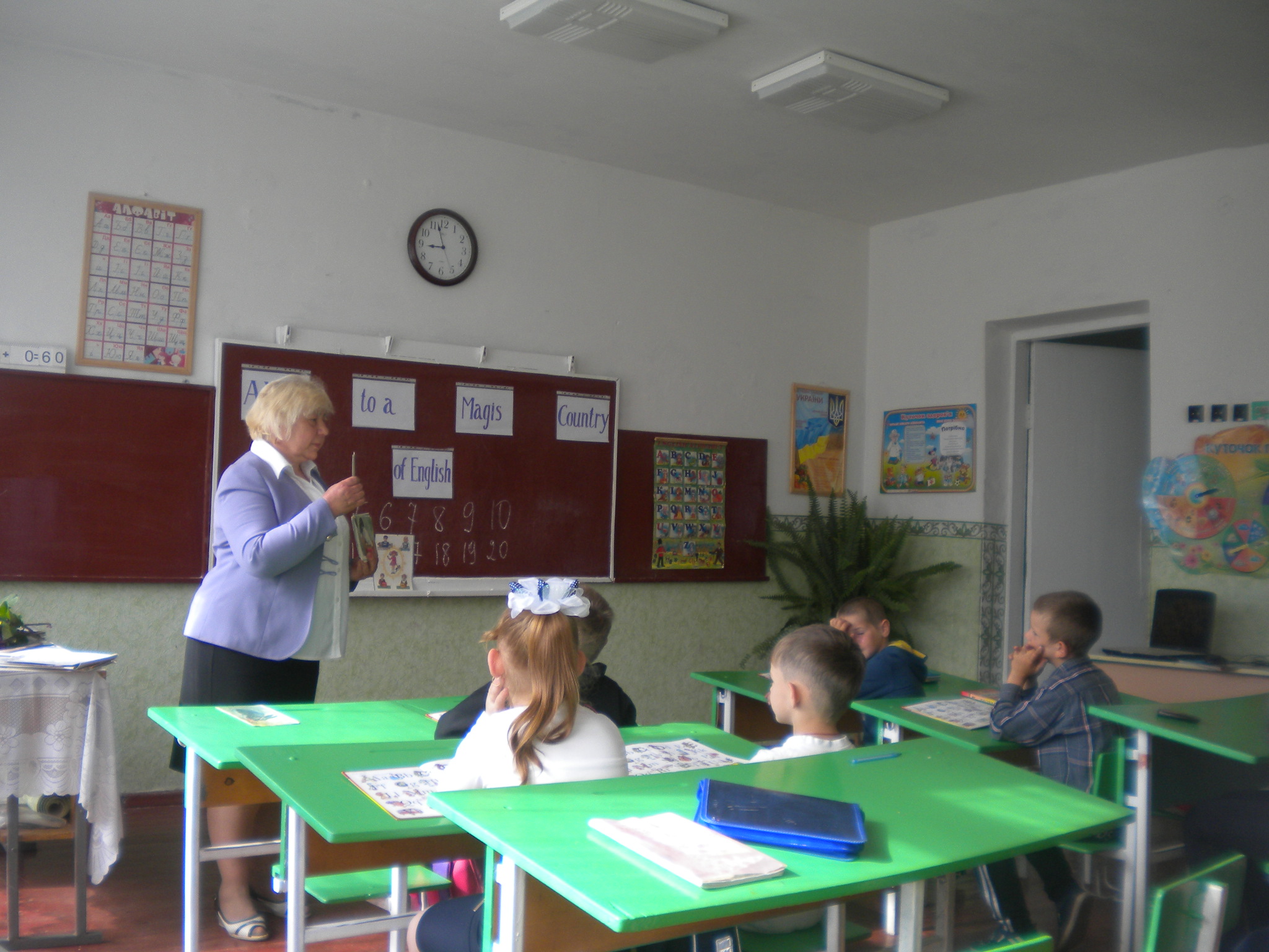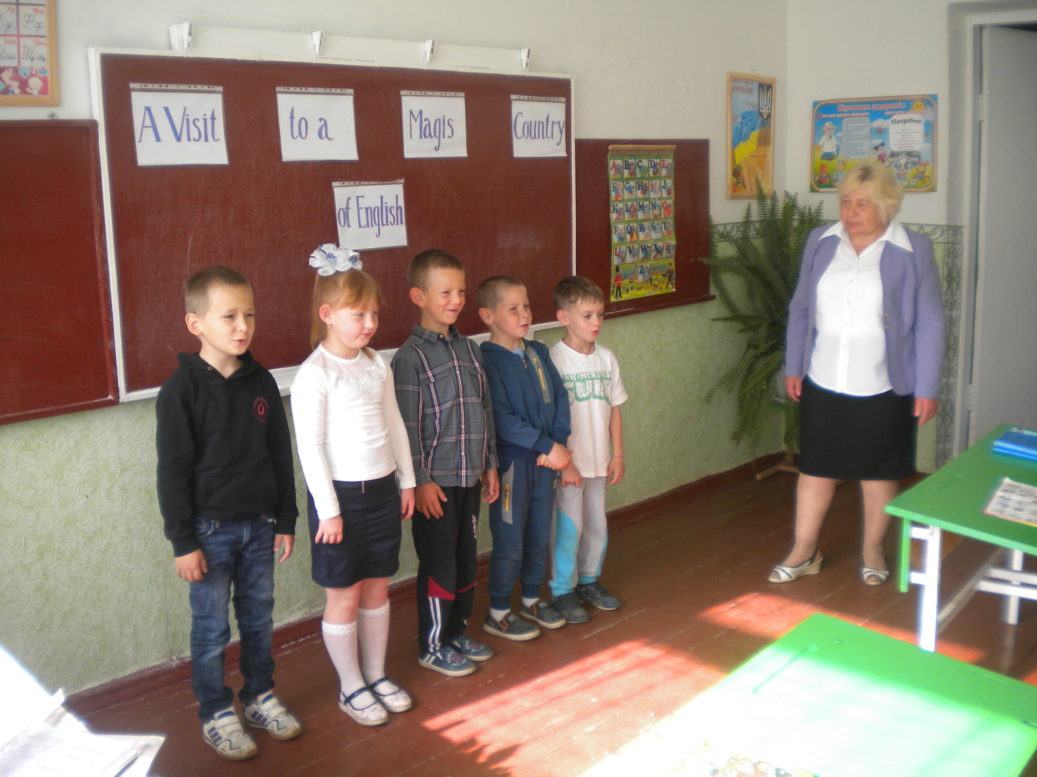Тому сьогодні, 23 травня, відбувся підсумковий урок в учнів 1 класу, на який прийшли їхні батьки та вчителі. Під час уроку учні показали свої знання алфавіту, словникового запасу, знання назв домашніх та диких тварин, знайомилися одне з одним, рахували, розповідали про сім'ю, вітали мам пісенькою з днем народження, співали пісеньку з рухами "Hello", а також про тварин, використовуючи відеозапис .